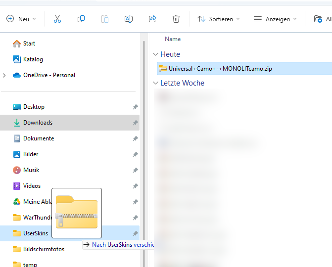 - Per Drag und Drop zieht Ihr jetzt das File auf Euren "UserSkins" Ordner links in der Leiste.