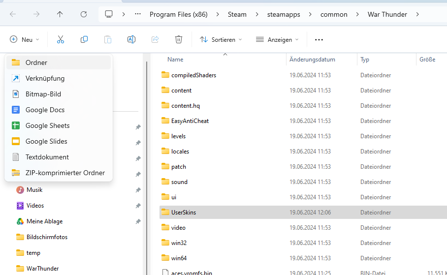 - Schiebt den Ordner UserSkins in euren Schnellzugriff der auf der linken Seite zu finden ist.